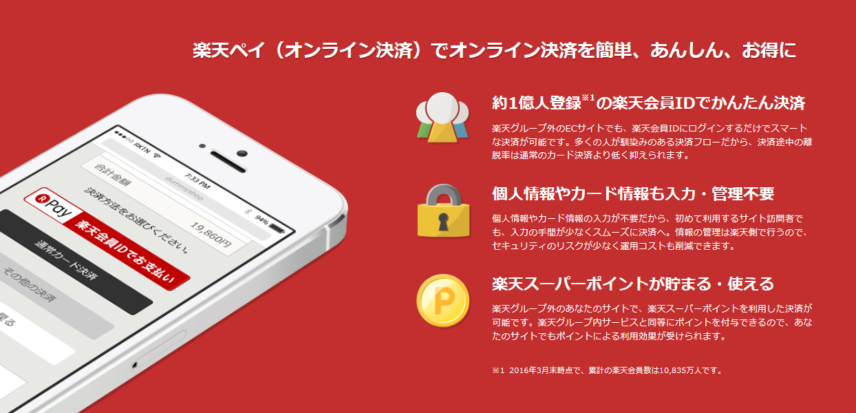 いつもの楽天会員IDとパスワードを使ってスムーズなお支払いが可能です。楽天ポイントが貯まる・使える!「簡単」「あんしん」「お得」な楽天ペイをご利用ください。