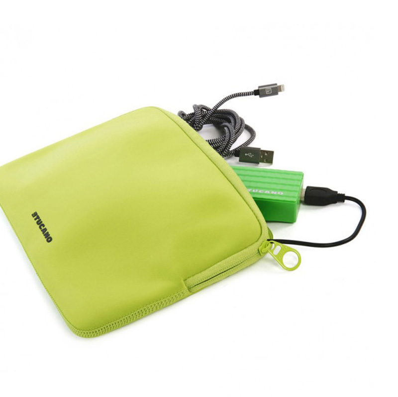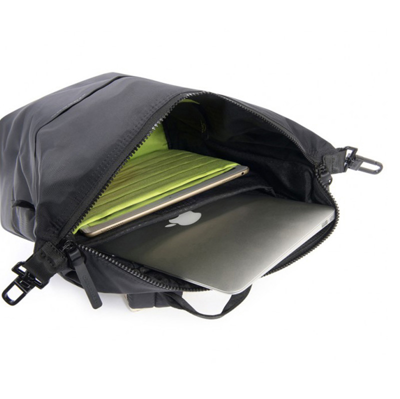 独特の丸みをおびたツートンパソコンケース。蛍光色の部分はポーチとしても使えて、取り外しが簡単であるため、ブラック一色でもお楽しみいただけます。ショルダーバッグ内もツートンカラーで作られたこだわりのデザイン。雨よけのためのカバーも付いています。