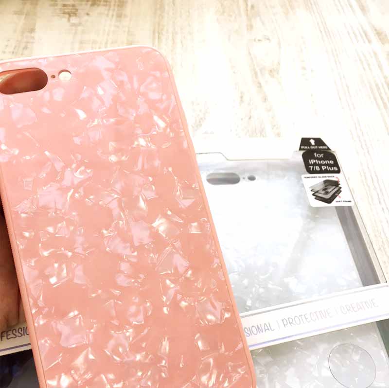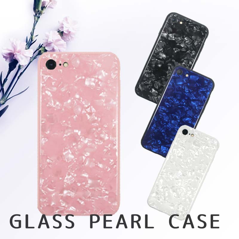 ネイルなどでも大人気のシェル素材を使った“GLASS PEARL CASE” はピンク・ブルー・ホワイト・ブラックの全4色で、iPhone8/iPhone7とiPhone8plus/7plus が対応機種となっています。
