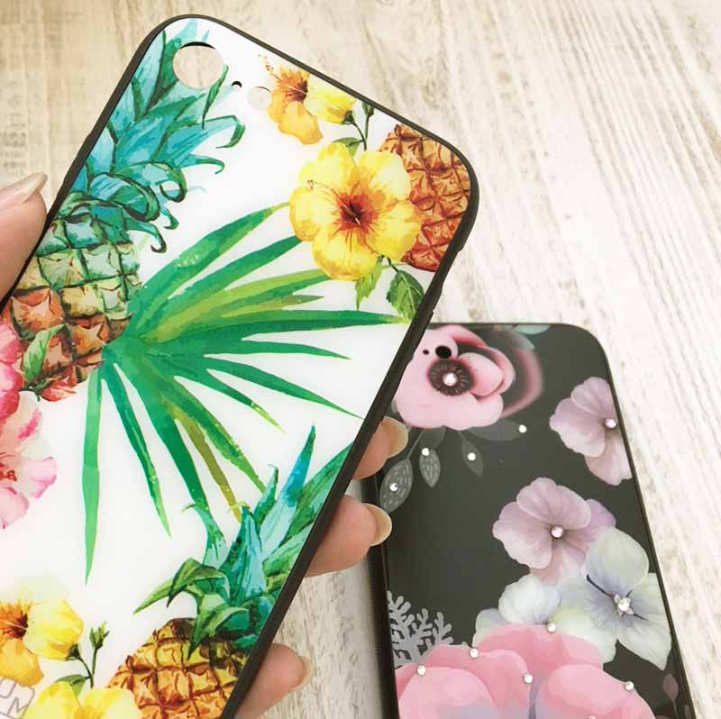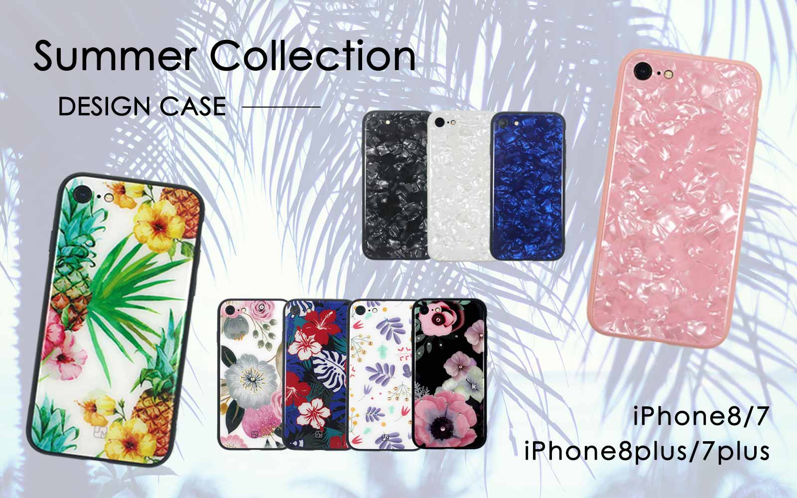 毎年、大人気のシェル素材をあしらった☆キラキラ☆なケースと、ハイビスカスやパイナップルがプリントされたCOOLなガラスプリントケースのご紹介です。