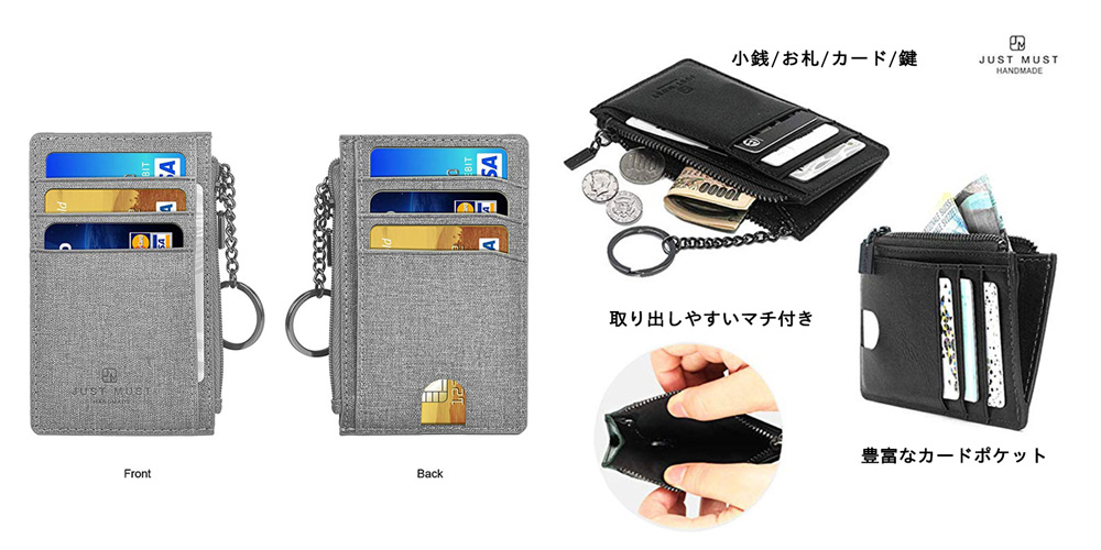 たくさんのポケットがあり、小銭・カード・鍵の3つを1つに持ち運べるミニ財布で、