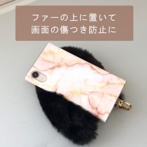 落下防止だけでなく、机にスマホを置くときに、ファーの上に置けば画面の傷付き防止にも!